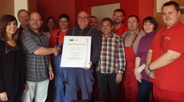 24. April 2014Für 25-jährige Betriebszugehörigkeit konnte Geschäftsführer Mathias Hachmann Herrn Rupert Lindner ehren. Fast seit Beginn des Unternehmens arbeitet er bei hachmann Rohrbiegetechnik. Neben Herrn Lindner sind viele Mitarbeiter bereits seit mehr als 15 Jahren dem Unternehmen treu. Herr Klaus Hachmann dankte als Seniorchef allen Mitarbeitern für ihre Loyalität und Mitarbeit während der letzten Jahre. Auf dem Bild ist ein Teil der Mannschaft von hachmann Rohrbiegetechnik versammelt. Hr. Hachmann überreicht hierbei Hr. Lindner die Anerkennungsurkunde.